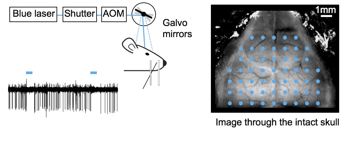 Manipulating neural activity and measuring the effect on behavior is a key tool for understanding the function of a structure in the brain. Sometimes, experimenters will manipulate activity in two areas to gain insight into the flow of information through the brain. In a poster this year at SFN, Nuo Li, a postdoc in Karel Svoboda’s lab, took things a big step further by systematically suppressing the activity of 55 locations, each 1 mm wide, in the cortex of individual mice. He achieved this by using a pair of mirror galvos to move a stimulating beam to different places in the brain. In a given session, he could inactivate the parietal cortex on some trials, the somatosensory cortex on other trials and the anterior lateral motor cortex (ALM) on others still. This approach has a few advantages: first, by surveying the cortex broadly, he leaves open the possibility of identifying relevant areas that weren’t even on his radar. Second, the approach avoids a common pitfall of traditional stimulation experiments: in those experiments, the animal can notice a change in its performance and adapts its strategy. A signature of this nonstationary strategy is usually apparent in control trials. Here, the stimulation causes different effects depending on WHERE its targeted and WHEN in the trial it takes place, making it a challenge for the animal to respond with an altered strategy.