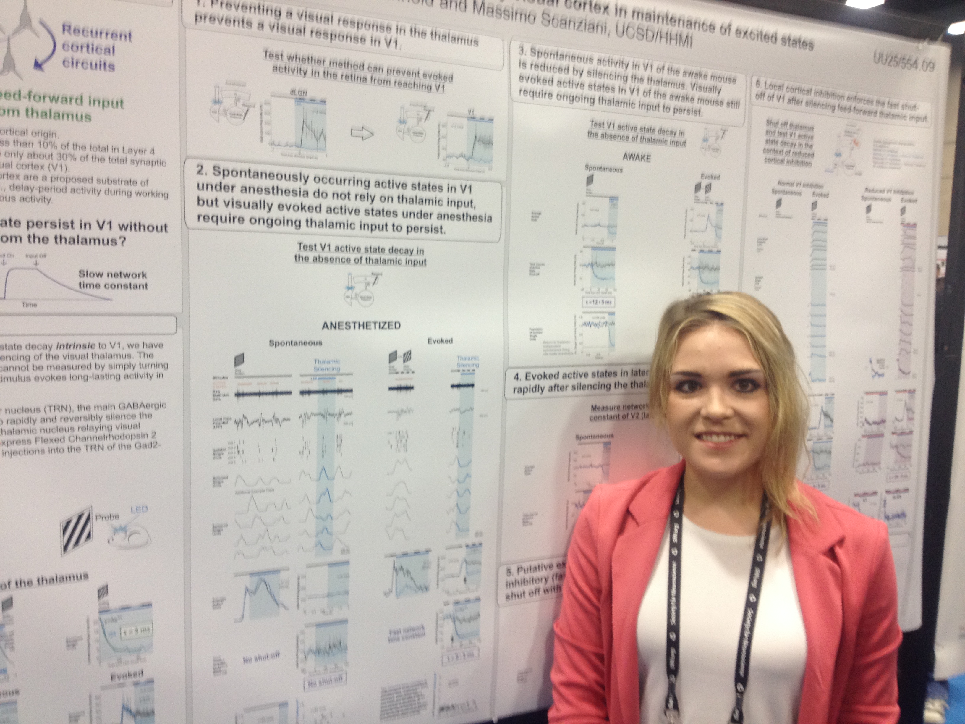 An intriguing poster from Kim Reinhold in Massimo Scanziani’s lab suggests the latter. She has been running experiments to determine the timescale over which cortical activity changes when she removes thalamic inputs (via an optogenetic strategy). She finds that the time constant for the decay of activity is super-fast: about 9 ms. Given that 9 ms is around the membrane time constant of the cell, it would seem at first that the membrane properties of individual cells define the time constant of persistent activity for the whole area. But the plot thickens: when Kim squelched cortical inhibition, the time constant got considerably longer. This observation suggests that inhibitory neurons actively squelch cortical responses thereby preventing persistent activity. Why might this be? Kim reasons that fast-acting inhibition would ensure that the visual cortex was always at-the-ready for new incoming stimuli. This suggests a tradeoff between the ability to maintain a persistent response, and the ability to response with high temporal resolution.