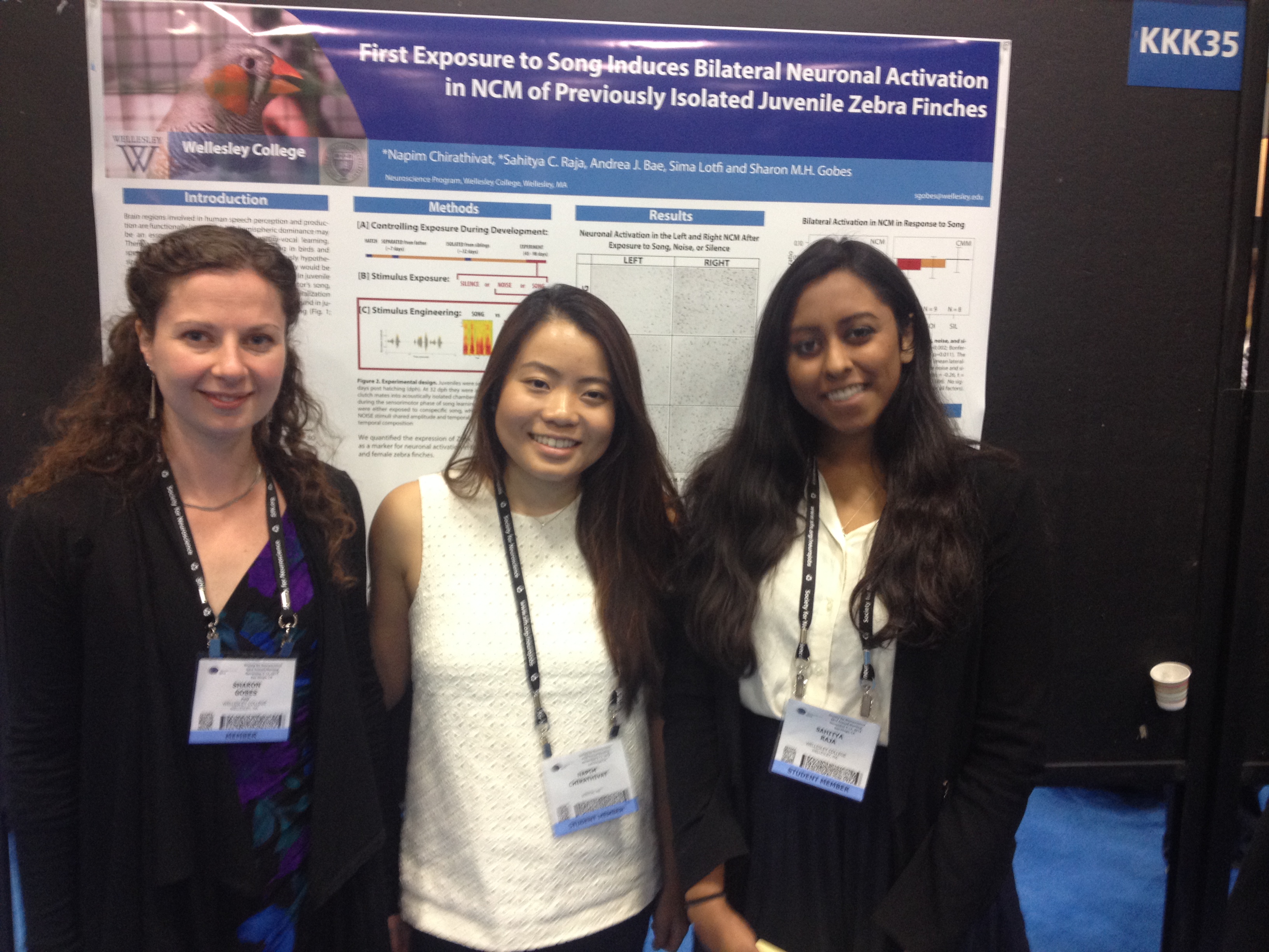 In humans, massive changes take place in the brain over the course of language learning in infants. A poster today from Wellesley College, presented by 3 undergraduate students from Sharon Gobes lab, hope to gain insight into this process by studying the brains of juvenile birds around the time they learn their father’s song. In birds, song is known to preferentially activate neurons on the left side of the brain; a leftwards lateralization is likewise seen in humans. The group wondered whether this is an active process: would song natually activate the left hemisphere, even in birds who weren’t exposed to song during development?